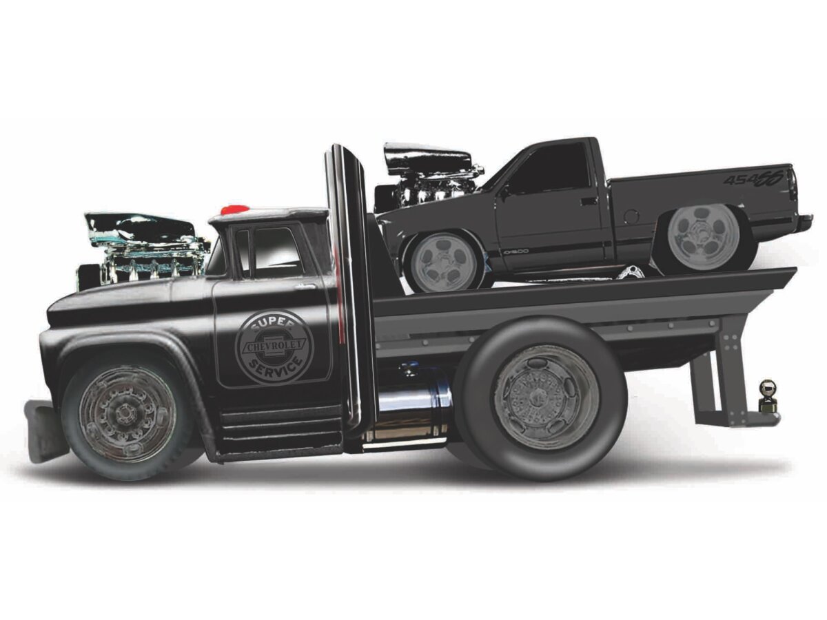 Gedetailleerd schaalmodel van de Chevrolet C60 1966 Flatbed + Chevrolet 454 Ss Pick Up 1993 in schaal 1:64 en kleur zwart.