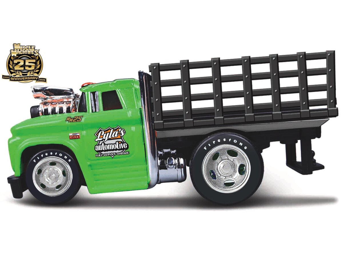 Gedetailleerd schaalmodel van de Christie C60 Stakebed 1966 – Muscle Machines in schaal 1:64 en kleur groen/zwart.