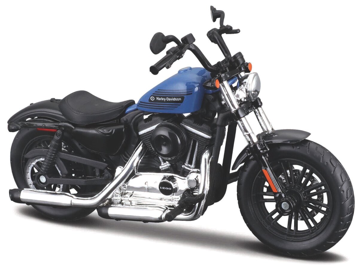 Gedetailleerd schaalmodel van de Harley-davidson Forty-eight Special 2022 in schaal 1:18 en kleur blauw/zwart.