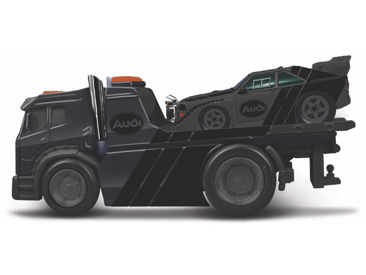 Gedetailleerd schaalmodel van de Jdm Flatbed + Audi Sport Quattro S1 E2 1986 in schaal 1:64 en kleur Donker Grijs/zwart.