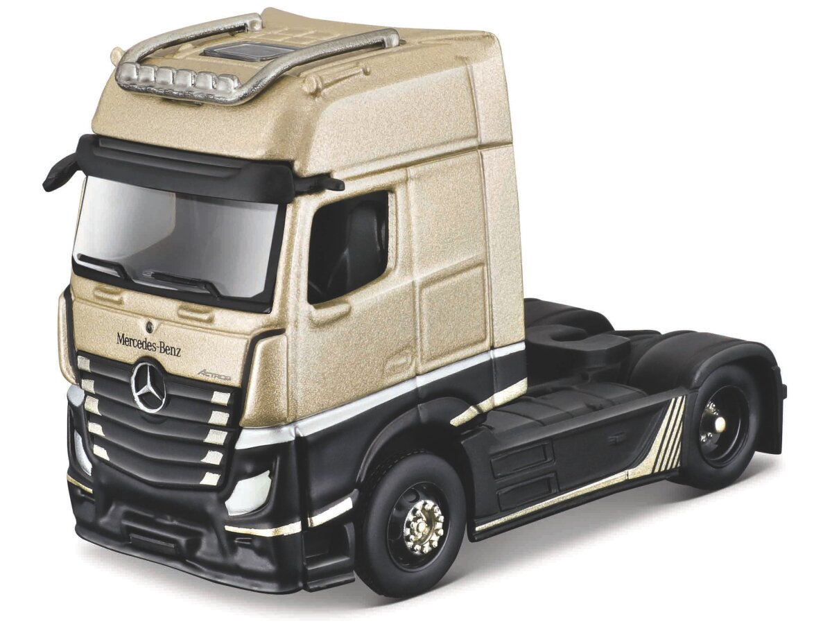 Gedetailleerd schaalmodel van de Mercedes Benz Actros 1851 Mp4 Giga Space ‘pull Back’ in schaal 1:64 en kleur goud/zwart.